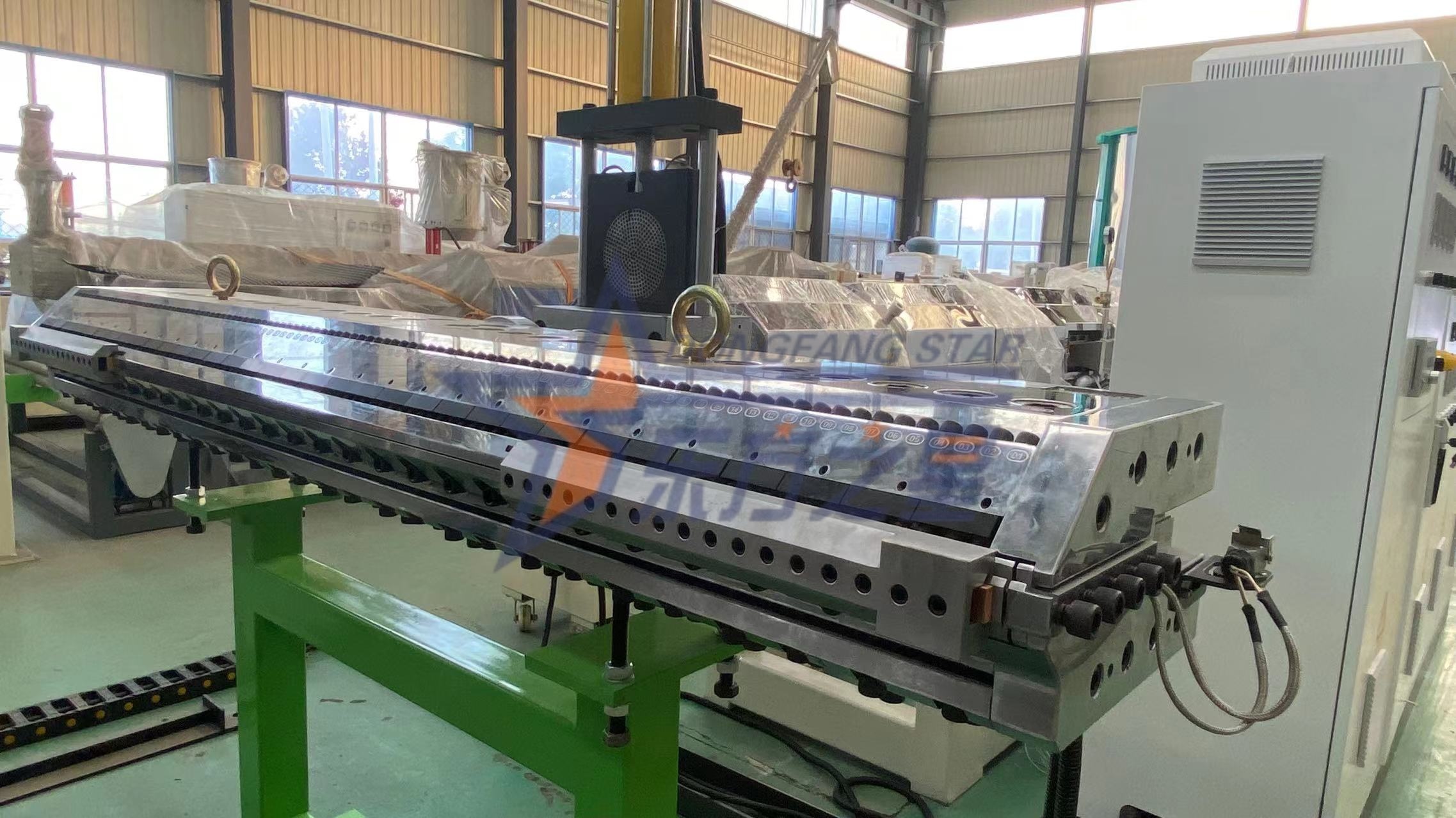 The Линия по производству листов ABS/HIPSв Циндао EASTSTAR специализируется на крупномасштабном производстве ABS (углеводородного сополимера) и HIPS (высокопрочных этилакрилатов).Линияимеет одношнековый экструдер J150-35/1, который производит листы диаметром около 2000 метров и одинаковой толщиной (1-6 мм).The экструдерполностью изготовлен из высококачественной азотированной стали 38CrMoAlA и оснащен преобразователем частоты ABB, что позволяет достигать производительности по этим двум видам сырья 400-600 кг/ч.