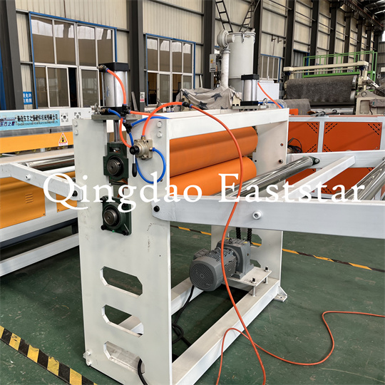 Оборудование для производства противоскользящих ковриков из ПВХ. Машина для производства мягких листов: оборудование в основном состоит из одношнекового экструдера, трехвалкового каландра, 6-метрового охлаждающего кронштейна, тяговой машины с резиновыми роликами, режущей машины и устройства конвейерной ленты.