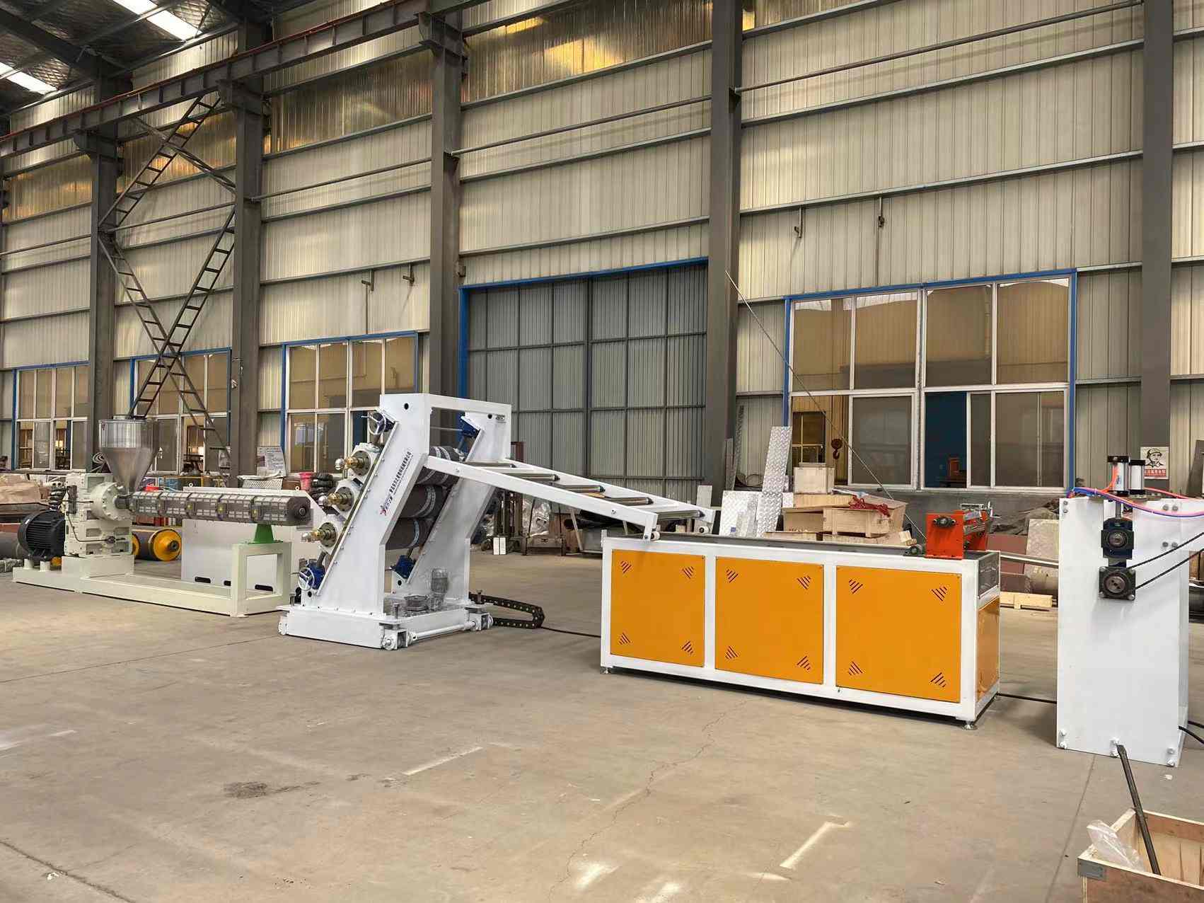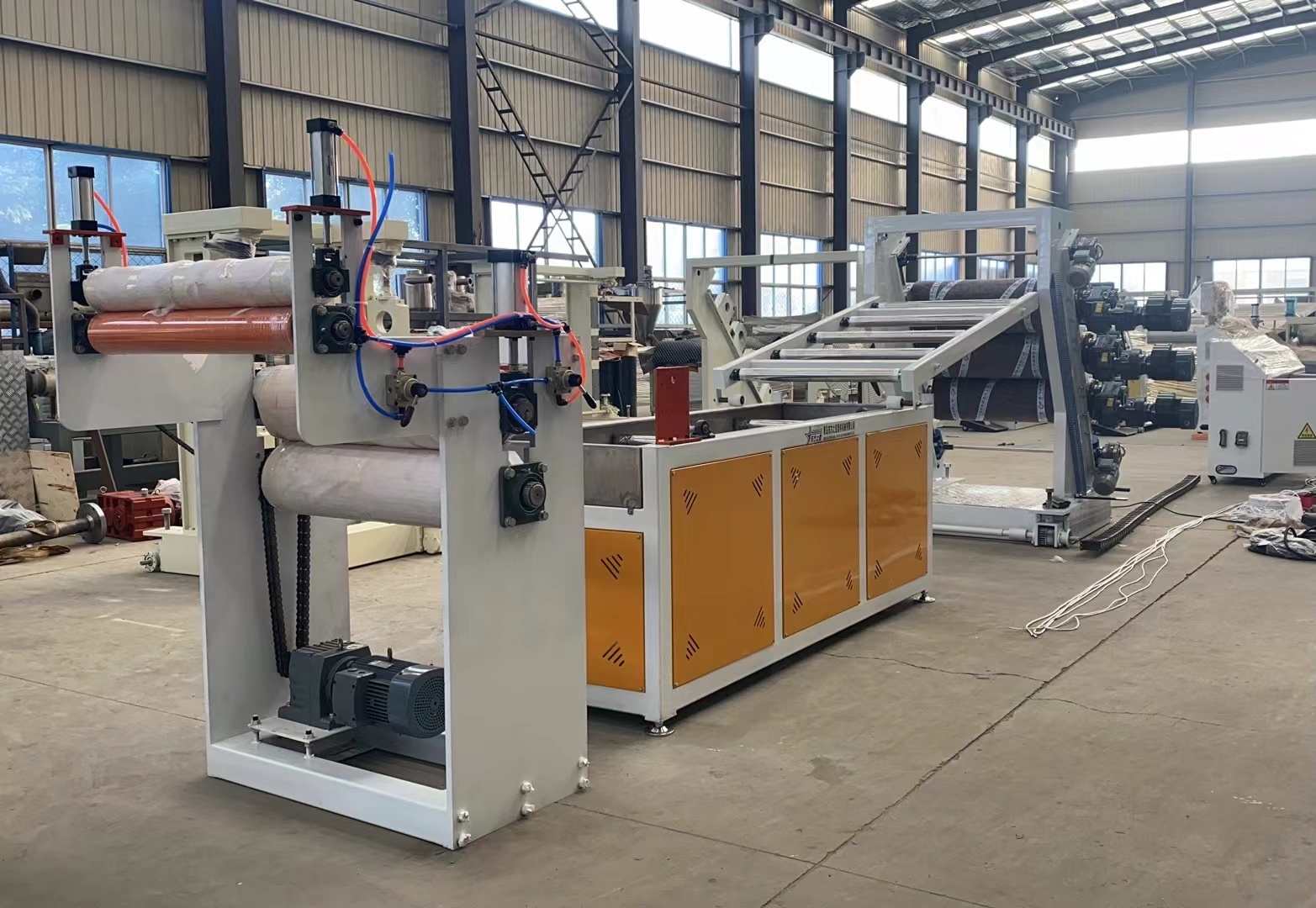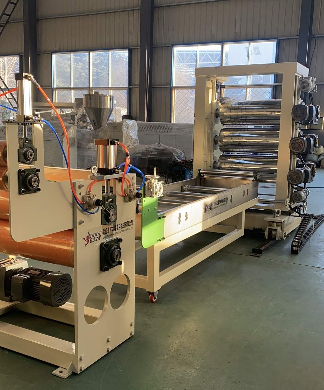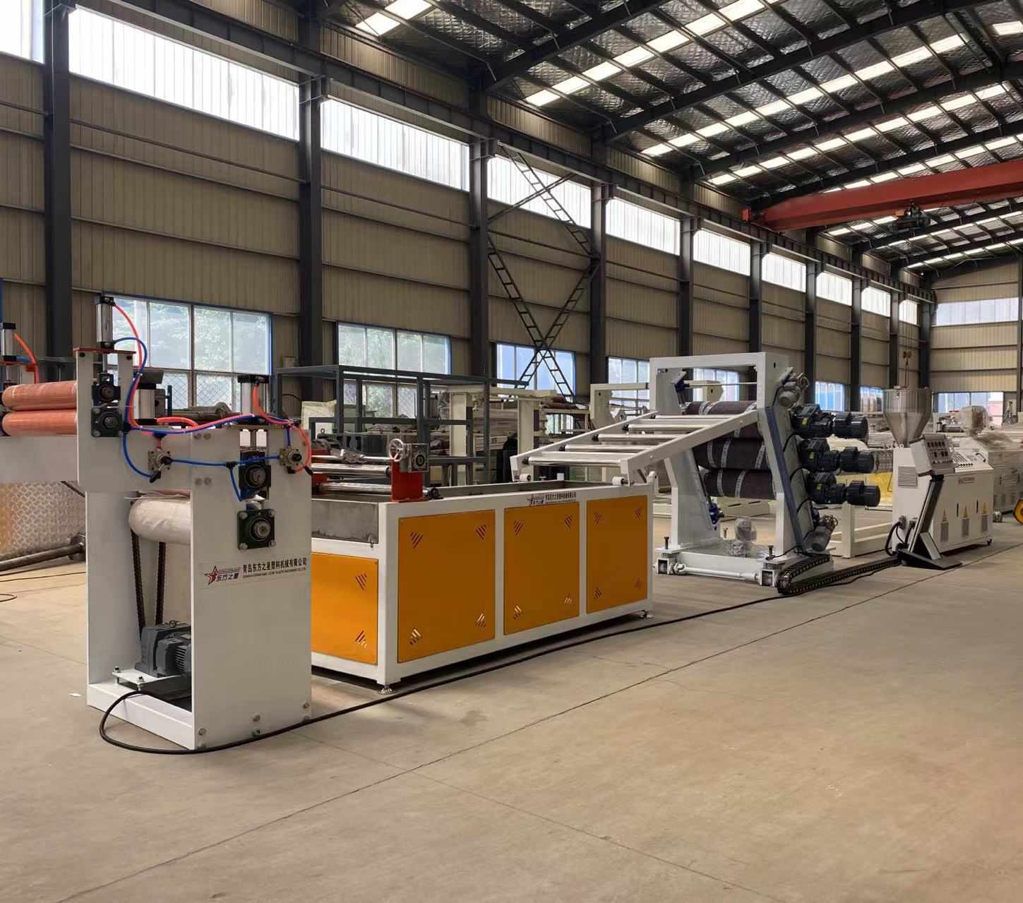 Линия по производству прозрачных мягких дверных штор из ПВХ: способна производить прозрачные пластиковые листы ПВХ шириной от 200 до 600 миллиметров и толщиной от 0,8 до 3 миллиметров. Оборудование включает в себя одношнековый экструдер SJ90 или SJ-120, регулируемую Т-образную гибкую матрицу, вертикальный или наклоненный под углом 45 градусов трехвалковый каландр, регулятор температуры воды «три в одном», охлаждающий кронштейн из нержавеющей стали, оснащенный регулируемым подрезным ножом широкой ширины, тяговую машину с резиновыми роликами и двухпозиционную намоточную машину с воздушным расширением вала. Выпускаемые листы имеют глянцевую поверхность, высокую прозрачность, мягкость, отсутствие трещин, запаха, пузырей, гибкие, морозостойкие, износостойкие, кислото-щелочностойкие, коррозионностойкие.