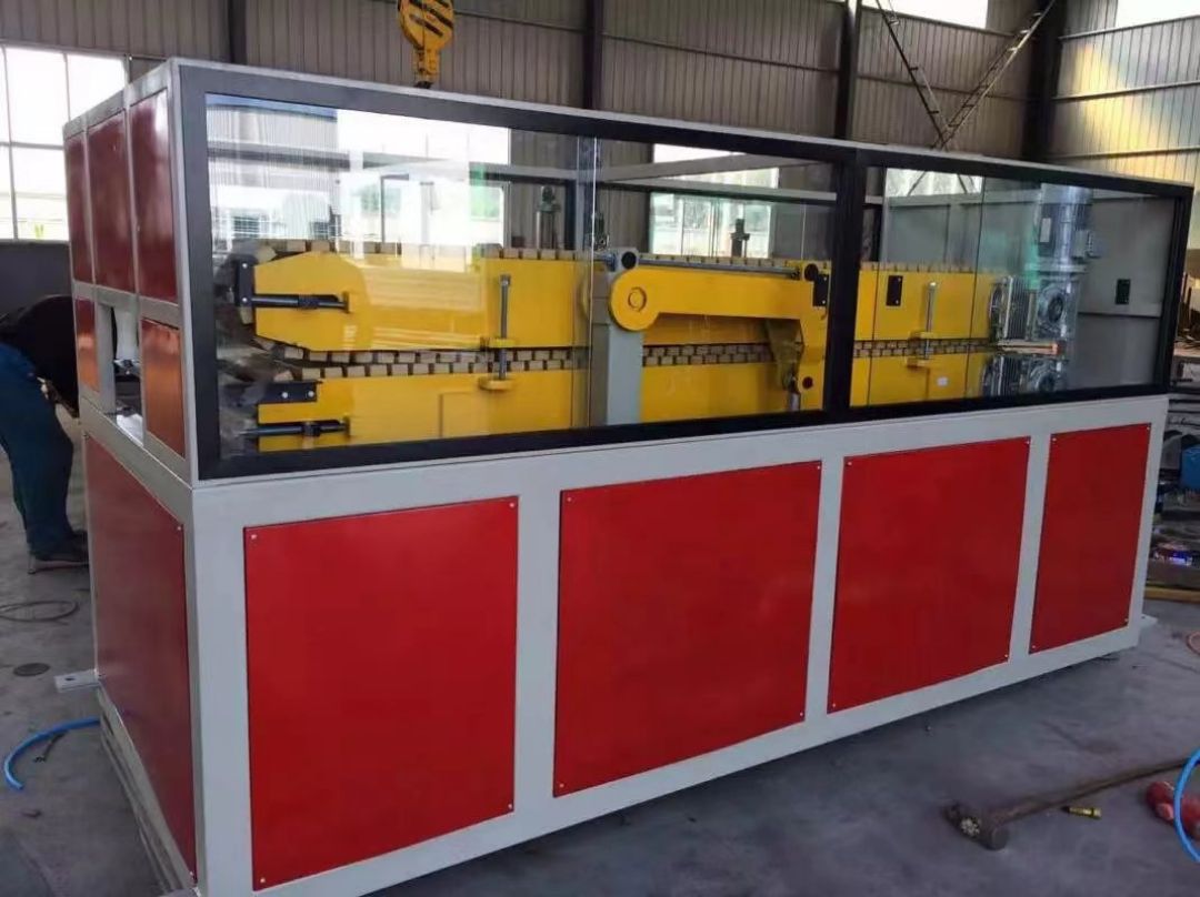 Линия по производству стеновых панелей из ПВХ в основном состоит из конического двухшнекового экструдера, стола для вакуумной формовки, трактора, отрезного станка и стеллажа для приема материала.