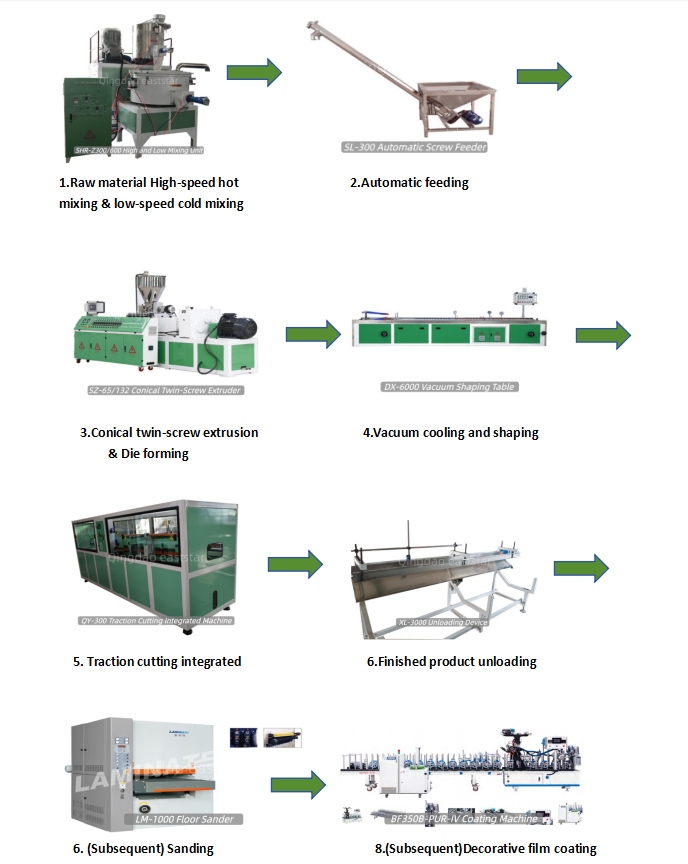 A1: Экструзионная линия по производству напольных покрытий SPC является основным оборудованием, используемым для крупномасштабного производства каменно-пластиковых композитных полов (SPC). Он использует конический двухшнековый экструдер для пластификации и уплотнения смеси каменного порошка и ПВХ, формирования подложки для пола с помощью матрицы, а затем производства высококачественных плит для полов SPC посредством процессов охлаждения, формования и резки.