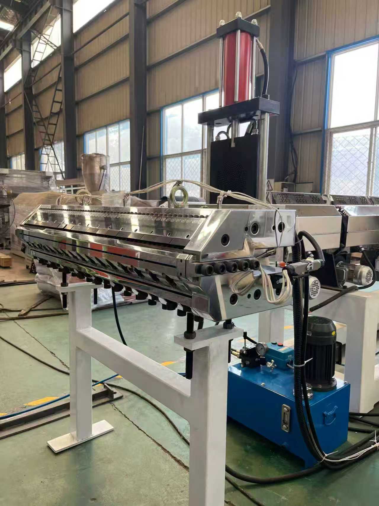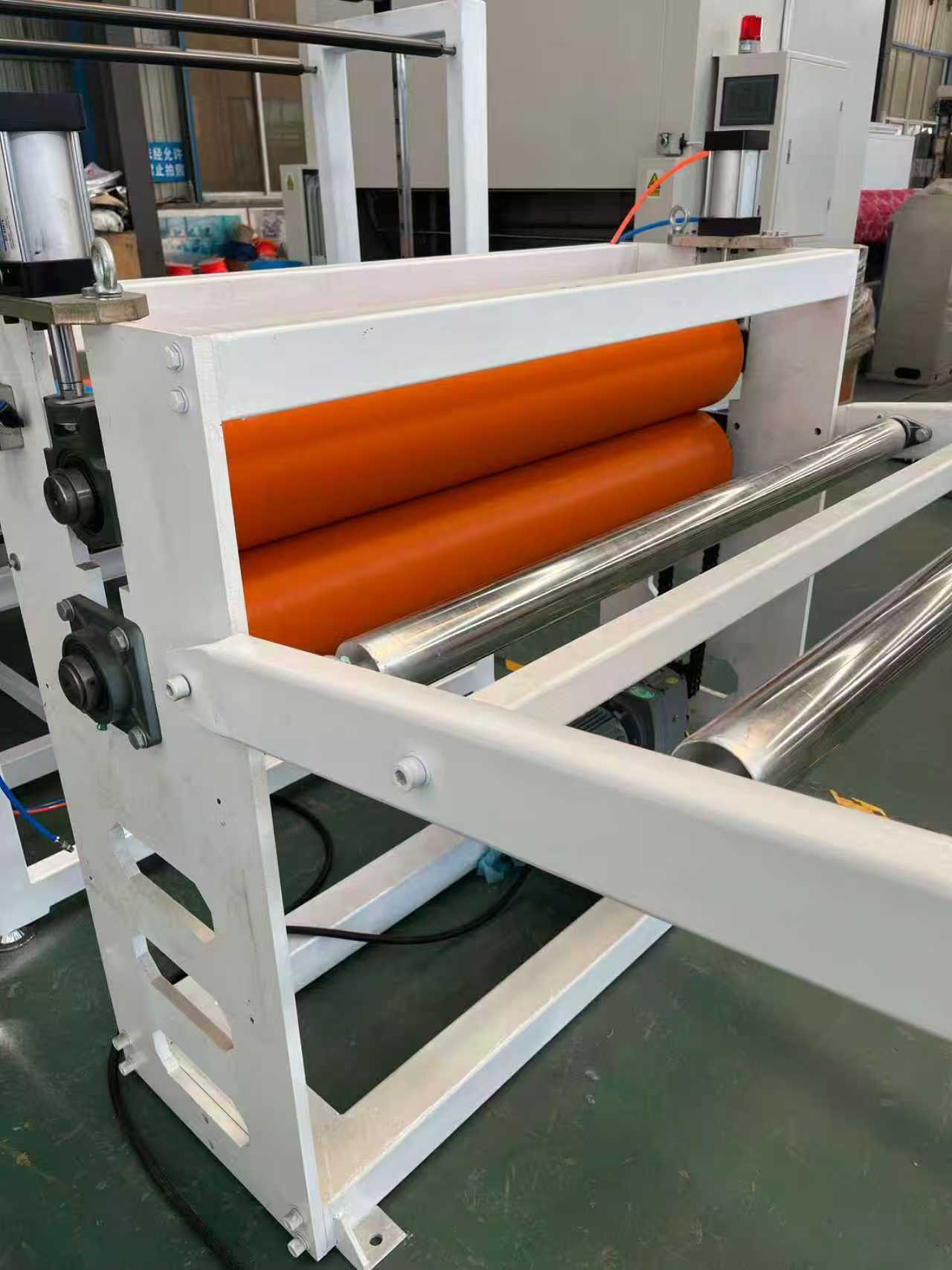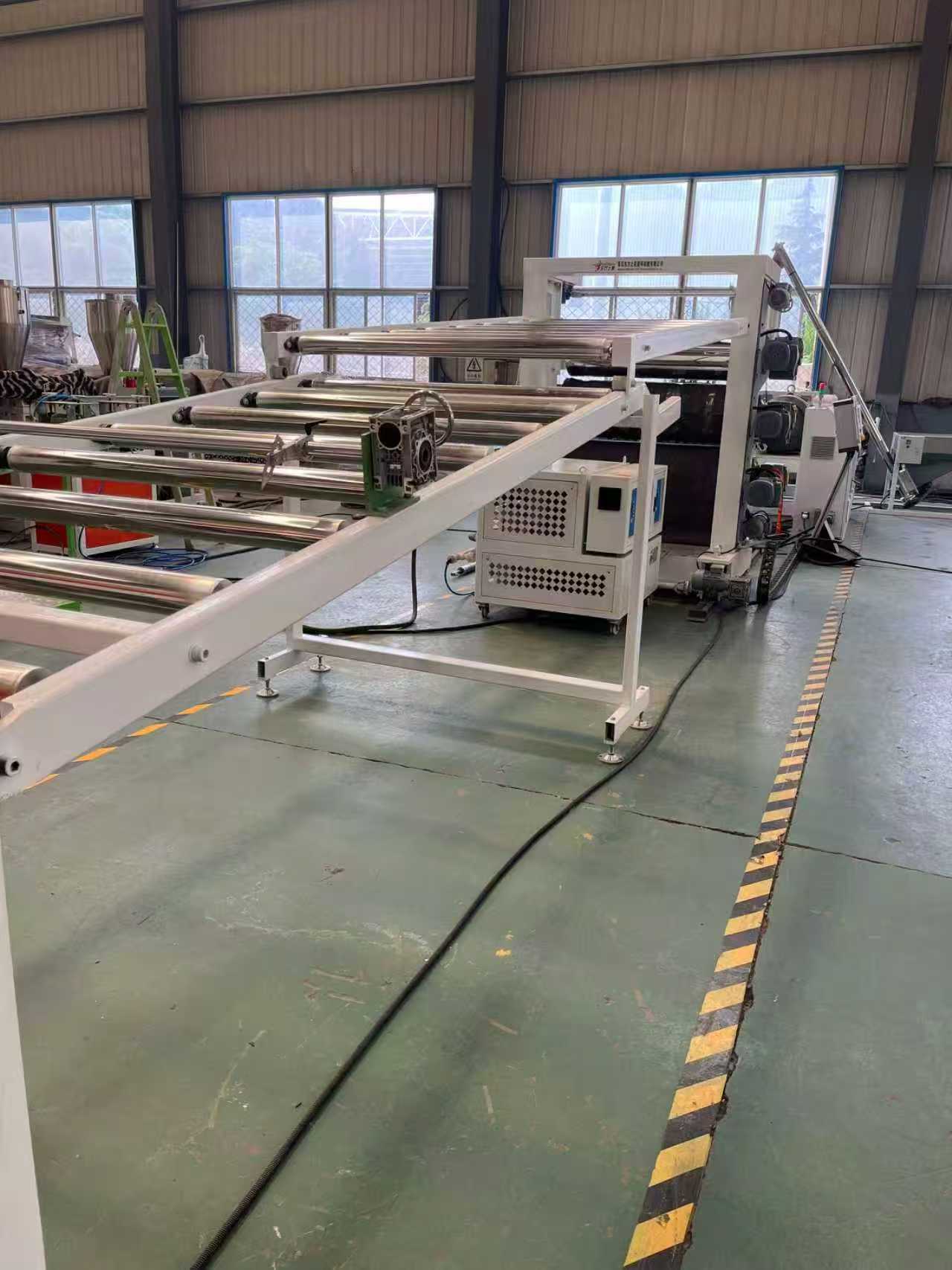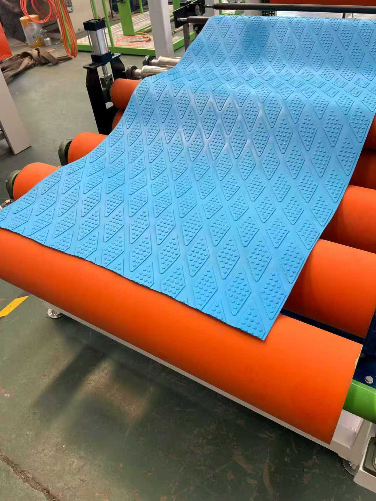 Экструзионная линия по производству шлангов, армированных стальной проволокой ПВХПротивоскользящие коврики TPE-1000 мм. Автомобильные коврики: оборудование в основном состоит из одношнекового экструдера, трехвалкового каландра, 6-метрового охлаждающего кронштейна, тяговой машины с резиновыми роликами, режущей машины и устройства конвейерной ленты.